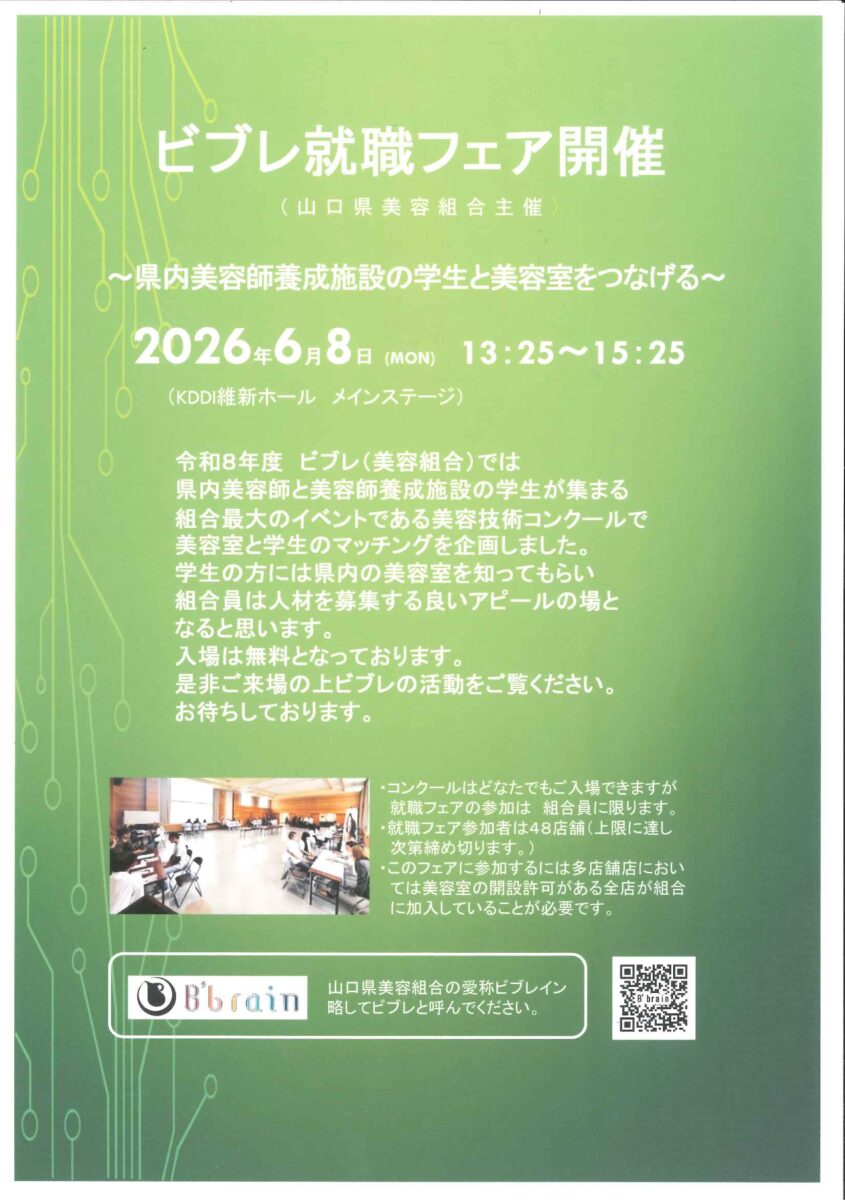 令和8年6月8日(月)KDDI維新ホールにて、山口県美容技術コンクールを開催します。同日、ビブレ就職フェアも開催します。キッチンカーもやってきます!